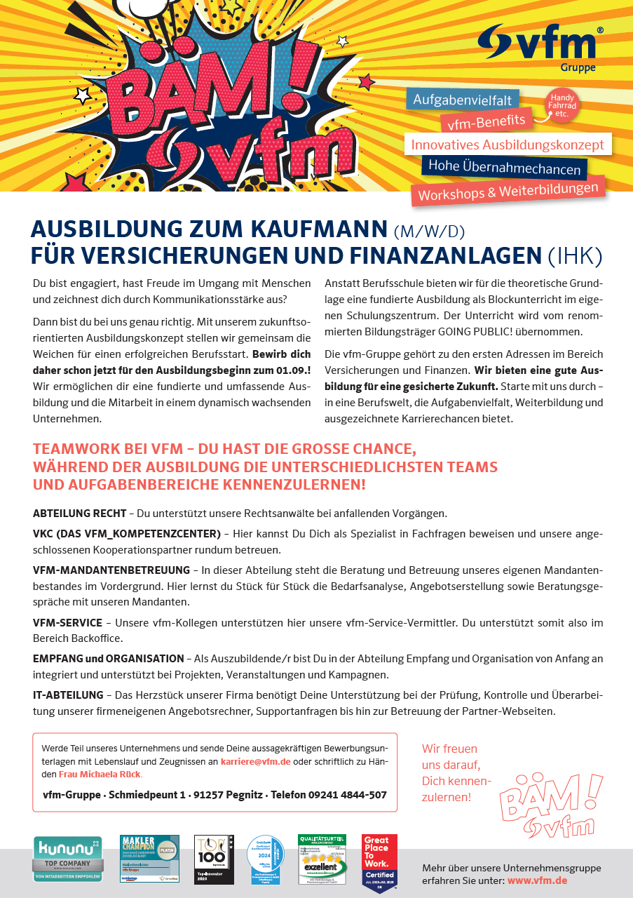 Die vfm-Gruppe gehört zu den ersten Adressen im Bereich Versicherungen und Finanzen. Wir bieten eine gute Ausbildung für eine gesicherte Zukunft. Starte mit uns durch – in eine Berufswelt, die Aufgabenvielfalt, Weiterbildung und ausgezeichnete Karrierechancen bietet.