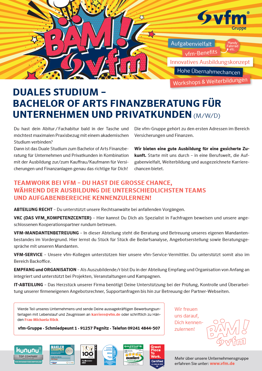 Die vfm-Gruppe gehört zu den ersten Adressen im Bereich Versicherungen und Finanzen. Wir bieten eine gute Ausbildung für eine gesicherte Zukunft. Starte mit uns durch – in eine Berufswelt, die Aufgabenvielfalt, Weiterbildung und ausgezeichnete Karrierechancen bietet.