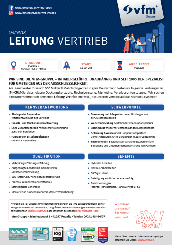 - Erfahrung in der B2B-Kundenbetreuung: hohe Serviceorientierung gegenüber unseren vfm-Kooperationspartnern