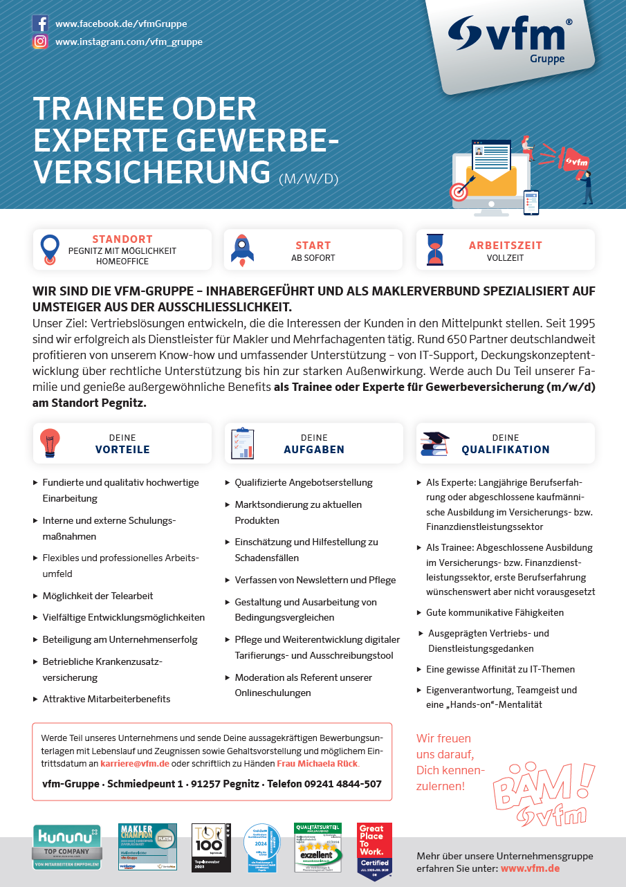 Werde Teil unseres Unternehmens und sende Deine aussagekräftigen Bewerbungsunterlagen mit Lebenslauf und Zeugnissen sowie Gehaltsvorstellung und möglichem Eintrittsdatum an karriere@vfm.de oder schriftlich zu Händen Frau Michaela Rück.